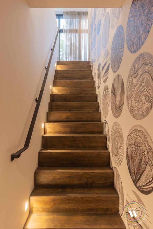 Op de souterrainverdieping creëerden we een oase van rust door een ruime masterbedroom en een tweede slaapkamer te realiseren. De masterbedroom voorzagen we van een aangrenzende badkamer en royale walk-in closet. Bij de tweede slaapkamer realiseerden we een kleine, maar elegante badkamer. Naast deze slaapvertrekken is er ook gedacht aan praktische ruimtes, namelijk een grote bergruimte en een wasruimte. Er is zoveel mogelijk gewerkt met duurzame materialen en sfeervolle kleuren die gebaseerd zijn op de principes van Feng Shui en de smaak van de bewoners, waardoor een harmonieuze en rustgevende atmosfeer is gecreëerd.