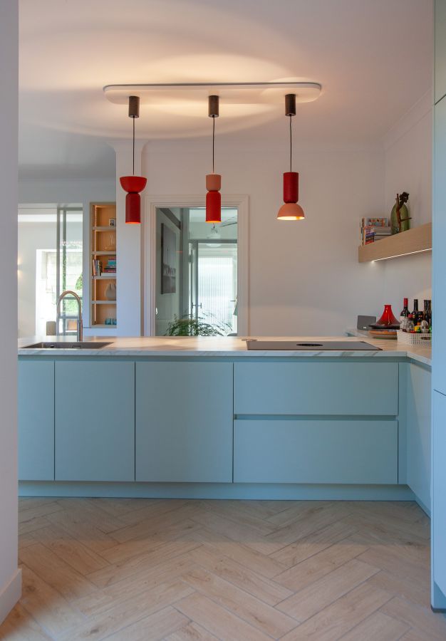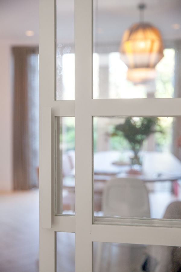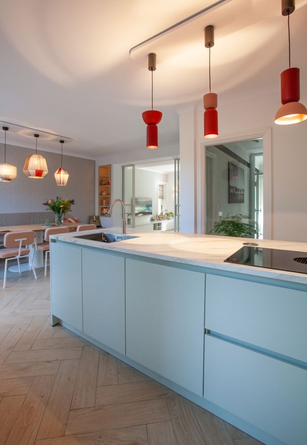 Om dit te realiseren hebben we de bestaande wand tussen de keuken en woonkamer verwijderd en de gehele aanbouw waar de bijkeuken in zat is opnieuw opgetrokken en qua hoogte gelijk gemaakt met de rest van de woning. Hierdoor ontstond veel meer ruimte om de indeling naar wens te maken en zelfs de ensuite (roomdivider) tussen de leefkeuken en zithoek in ere te herstellen. Om rust en balans in de ruimtes te creëren is gekozen voor een zacht en natuurlijk kleurenpallet met hier en daar een pittig accdent. Ook voor de keuze in materialen is gekeken naar de Feng Shui analyse van de woning en is voor zo veel mogelijk natuurlijke materialen gekozen. Dit is precies wat Tim en Marjolein voor ogen hadden! Het huis straalt rust en warmte uit en heeft de sfeer die naadloos aansluit bij Tim en Marjolein en hun gezin.