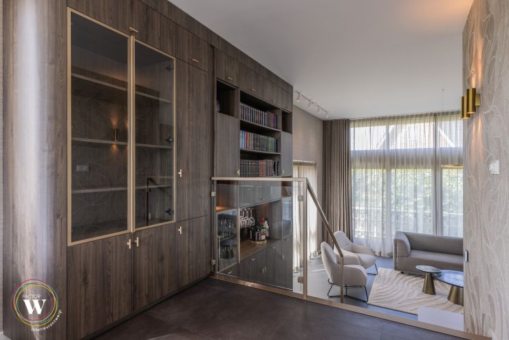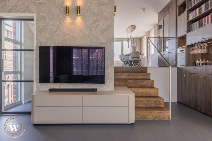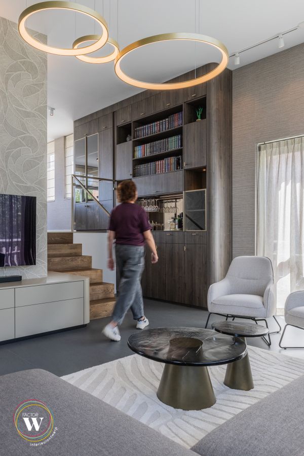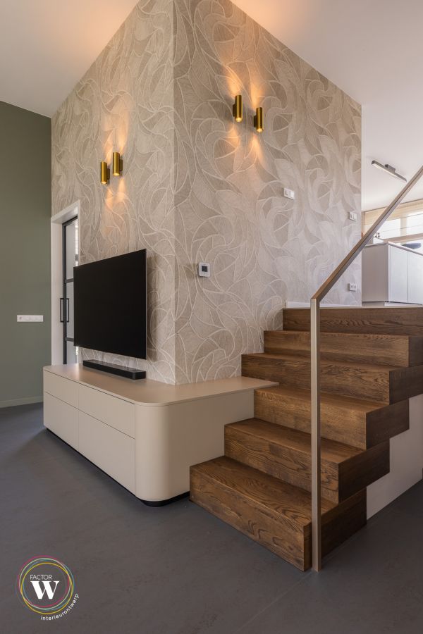 Factor-W heeft hen geholpen met de de indeling, het lichtplan en de keuzes in kleuren en toe te passen materialen en meubels. Vanuit het ontwerp van de nieuwe indeling ontstond het idee van de maatwerk kastenwand en de nieuwe trap met geïntegreerd TV-meubel. Door hen mee te nemen in het ontwerpproces en stap voor stap te werk te gaan ontstond vertrouwen en durfden ze net dat stapje verder te zetten waardoor het spannender is geworden dan ze zelf van tevoren hadden bedacht.